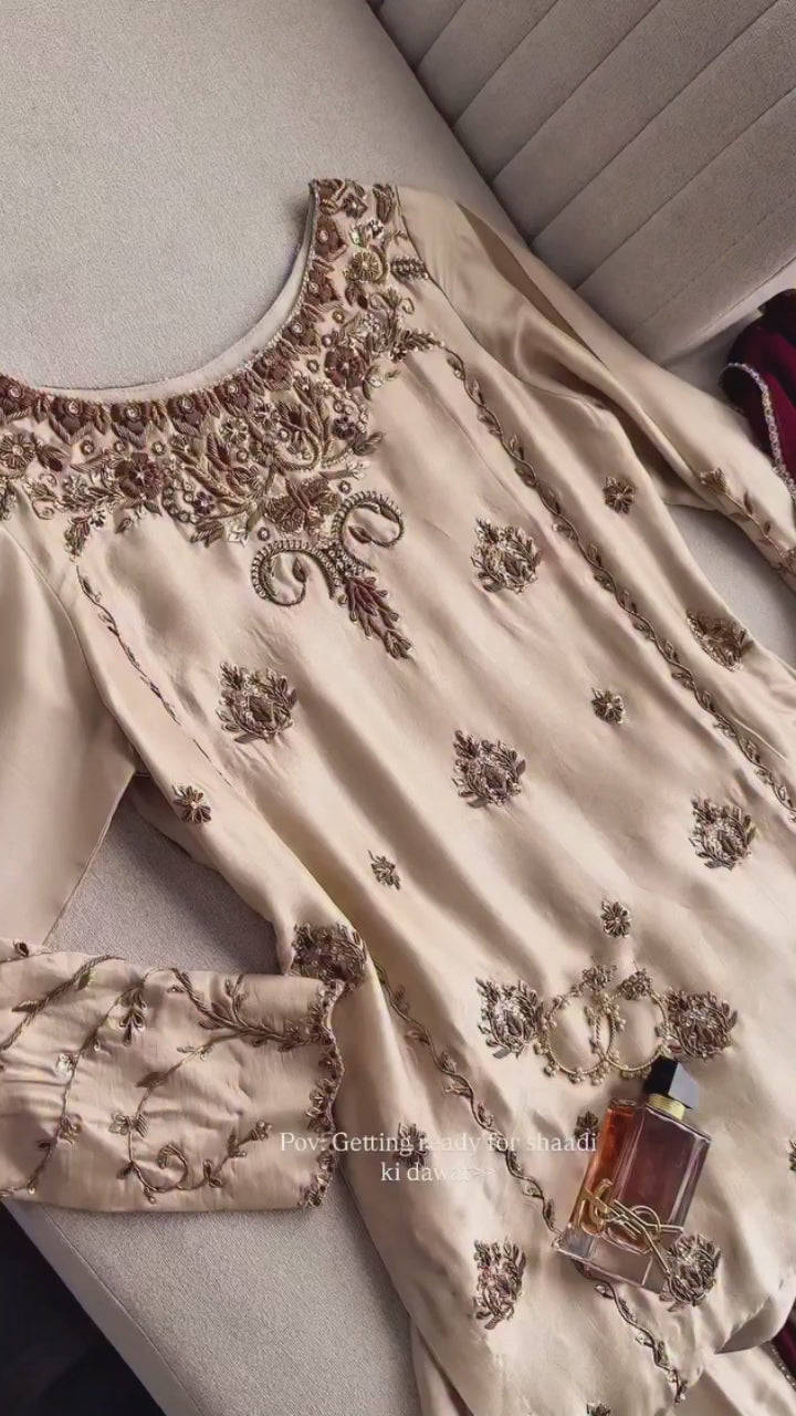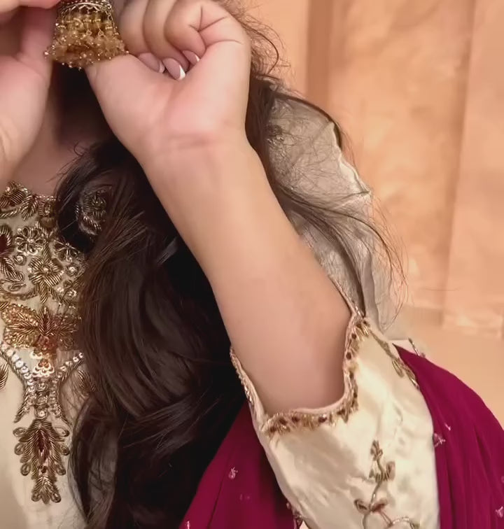 This exquisite set features a short biscuit-toned kameez crafted from premium tussle silk, adorned with intricate antique gold embellishments. The deep berry chiffon dupatta introduces a captivating contrast, enhanced with delicate scattered detailing and lace edging.